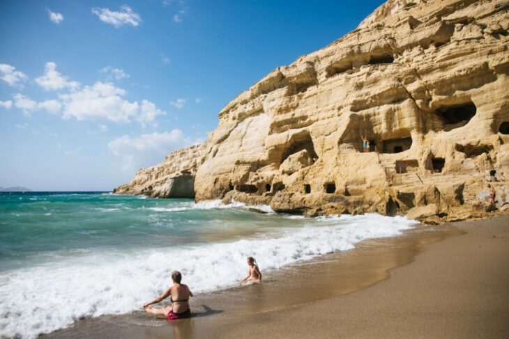 Anciennement connue comme le royaume des hippies, la plage de Matala se trouve au bout de la route dans la partie sud de la Crète. C’est un lieu de rêve dont le sable est jonché de petits cailloux. Il abrite également une falaise comportant des grottes qui servaient de résidence aux hippies. En plus de visiter ses grottes, la sécurité de la baignade sur la plage de Matala est garantie par un maitre-nageur. En effet, les courants et les vagues peuvent s’avérer dangereux en raison de leur puissance. Entre deux baignades, les restaurants et bars en bordure de mer sont pris d’assaut par les vacanciers pour un bon rafraichissement.